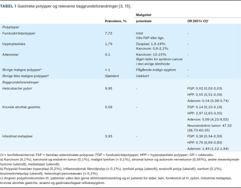 I Tabel 1 er de hyppigste slimhindeforandringer med betydning for forekomsten af polypper beskrevet. Prævalensen samt oddsratio (OR) bygger på amerikanske registerdata fra endoskopidatabasen The Miraca Life Sciences Database, for perioden januar 2008 til august 2013. OR er justeret for alder, køn, forekomst af H. pylori, IM, KAG, anæmi og gastroesofageal reflukssygdom [3].