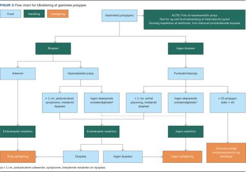 Undersøgelse med inspektion og eventuelle biopsier for Helicobacter pylori-infektion, atrofi eller intestinal metaplasi i relation til polypper er essentielt.