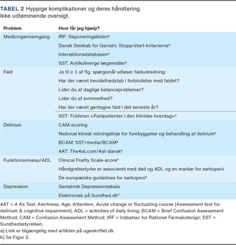 Modtagelse af akut indlagte ældre stiller krav til den diagnostiske tankegang. Man skal tænke bredt, udvide sin diagnostik tidligt og ikke stille sig tilfreds med det første positive fund. Oftest skal anamnesen suppleres ved kontakt til pårørende eller hjemmepleje. Faktorer, der bør have særlig opmærksomhed, er samlet i Tabel 1. Typiske komplikationer og deres håndtering er samlet i Figur 1.