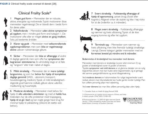 Vurdering af den fysiske funktion, og særligt graden af forværring i forbindelse med den aktuelle indlæggelse, bør indgå i den initiale lægefaglige risikovurdering. Som minimum skal man have patienten på benene og afdække det vanlige funktionsniveau. Der kan suppleres med vurdering ved en fysioterapeut, der kan objektivisere den fysiske funktion med håndgrebsstyrke eller rejse-sætte-sig-test. Fysisk funktionstab udløst af sygdom er allerede i gang, når patienterne ankommer til akutmodtagelsen, hvorfor det er vigtigt hurtigt at iværksætte fysioterapeutisk intervention. Således forebygges yderligere funktionstab, og afhængigheden ved udskrivelsen mindskes [27]. Som objektivt mål for funktionsniveau og skrøbelighed er Clinical Frailty Scale et oplagt og nemt redskab at anvende (Figur 2) [28].