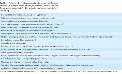 Alle læger med funktion i akutmodtagelsen bør have et basalt kendskab til identifikation, vurdering og behandling af denne særlige patientkategori, ligesom lægerne skal vide, hvornår der skal søges assistance fra det akutte geriatriske team eller henvises til en geriatrisk funktion.