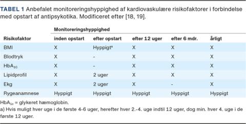 På baggrund af den øgede kardiovaskulære risiko blandt patienter med skizofreni har Sundhedsstyrelsen (2014) og The British Association of Psychopharmacology (2016) formuleret retningslinjer til monitorering og håndtering af metaboliske bivirkninger af antipsykotika [18, 19]. Her anbefales det at monitorere patienterne særdeles tæt i forbindelse med påbegyndelse af behandling med antipsykotika (Tabel 1). Der gøres opmærksom på, at evidensniveauet for anbefalingerne er lavt iht. standard of good practice [19]. Dog synes skærpet opmærksomhed på metaboliske bivirkninger, navnlig i begyndelsen af behandlingsforløbet, at være fornuftigt, idet en mindre gruppe oplever meget hurtigt indsættende vægtøgning.