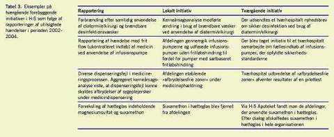 I Tabel 3 er der angivet eksempler på lokale ændringer, ændringer på hospitalsniveau og tiltag på tværs af hele organisationen, som de forekom efter rapporteringer af utilsigtede hændelser.