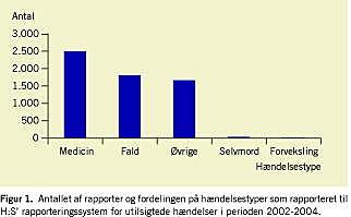 Antallet af rapporter i 2002-2004 og fordelingen fremgår af Figur 1 . Af medicineringsfejlsrapporterne medførte langt de fleste ingen skader på patienterne, 214 medførte moderate skader, og syv medførte katastrofale skader. Dette er klassificeret efter den faktuelle Safety Assessment Code (SAC). Faktuel betegner de konsekvenser, hændelsen rent faktisk havde for den eller de involverede patienter. Potentiel er betegnelsen for den skade, der kunne være sket ud fra de foreliggende data, hvis patienten ikke havde været robust. Den potentielle scoring viser, at en sjettedel af hændelserne havde potentiale til at få katastrofale følger for patienterne. I samme periode blev der foretaget 92 kerneårsagsanalyser, hvoraf de 23 var under hændelsestypen selvmord, otte under hændelsestypen medicineringsfejl, seks under hændelsestypen forvekslinger, to under hændelsestypen fald og endelig 53 i kategorien øvrige. I Tabel 4 ses eksempler på analyser inden for området »øvrige hændelser«.
