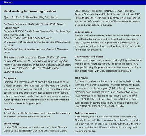Cochraneanalysen belyser i virkeligheden to meget forskellige senarier: 1) Det store globale problem om infektiøse diaretilstande som tidligere anført, og 2) institutionshygiejne i ilande. Der er i flere af de inkluderede arbejder parallelle tiltag til håndvask, hvorfor det derfor ikke er helt klart, om det er håndvaskeproceduren eller f.eks. undervisning om defækation under egnede forhold (latriner), som vejer tungest for evt. nedsat diaretendens.