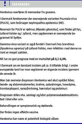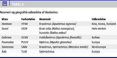 Hantavirus tilhører virusfamilien Bunyaviridae, genus Hantavirus. Det er en kappebærende RNA-virus, som forekommer globalt og kan forårsage en potentielt livsfarlig lunge- og nyreinfektion. Sygdommen er beskrevet igennem historien i blandt andet Rusland, Kina og Skandinavien, men fik specielt fokus i perioden 1951-1954 under Koreakrigen. Ca. 3.400 amerikanske soldater fik svær akut sygdom med feber, myalgier, hæmoragisk diatese og akut nyreinsufficiens. Mortaliteten var ca. 10%. Sygdommen blev betegnet koreansk hæmoragisk feber eller epidemisk hæmoragisk feber [1, 2]. Det var dog først et par årtier senere, i 1976, at Hantavirus blev isoleret i brandmus (Apodemus agrarius) fra området omkring Hantaanfloden i Korea [3]. I 1993 fik Hantavirus igen opmærksomhed, da den var årsag til tilfælde af Hantavirus -kardiopulmonalt syndrom (HCPS) i regionen Four Corners i USA [4]. Indtil videre er der fundet mindst 22 Hantavirus -arter, som kan forårsage sygdom hos mennesker, og som alle medfører et lidt forskelligt sygdomsbillede. De mest almindelige arter er Hantaan (HTNV), Seoul (SEOV), Dobrava (DOBV), Puumala (PUUV) og Sin Nombre (Tabel 1 ).