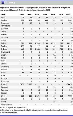 I andre europæiske lande har man i løbet af de seneste ti år registreret flere større udbrud af Hantavirus -infektioner med store regionale forskelle, hvor de endemiske områder typisk er store skovområder (Tabel 2 ) [14, 15].