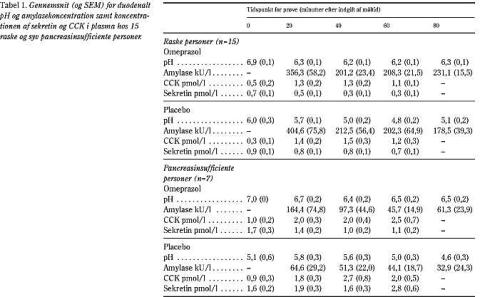 Resultat: Indtagelse af omeprazol medførte som ventet højere intraduodenalt pH, men ingen signifikant ændring i koncentrationen af pancreasamylase i duodenalaspirat. Ingen personer skiftede fra kategorien pancreasinsufficiens til normal eller omvendt. Bortset fra pancreasinsufficiente patienter, hvor P-sekretin var lavere efter omeprazol, havde syresekretionshæmning ingen effekt på koncentrationen af cholecystokinin eller sekretin i plasma.