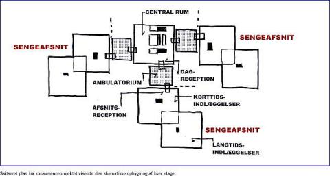 I konkurrenceforslaget fra Århus har hvert behandlingsafsnit - der er her tale om kliniske afdelinger - typisk hver sin etage, og afsnittet bevæger sig ud fra et centralrum. Idet sygehuset er karakteriseret ved, at patienter tilknyttes et afsnit i hele undersøgelses- og behandlingsforløbet, forudsættes det, at en del af undersøgelserne/behandlingerne kan decentraliseres til sengeafsnittene - dvs. ambulatoriefunktion og genoptræning. Derved skal patienterne ikke så hyppigt transporteres rundt på hospitalet til forskellige undersøgelser og behandlinger - med kontakt til et stort antal forskellige fagpersoner.