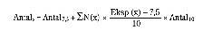 hvor antal7,5 blev beregnet i andet trin, N(x) er antal personer i kategori x af befolkningen (i millioner), Eksp (x) er den gennemsnitlige eksponering for PM10 i kategori x af befolkningen og Antal10 blev beregnet i tredje trin.