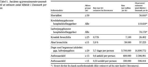 For de øvrige helbredseffekter findes der ikke eksakte data, hvorfor vi estimerede incidens- og prævalensrater ud fra danske og udenlandske studier. Vi antog, at incidensraten for kronisk bronchitis hos voksne over 24 år i Danmark var den samme som i et amerikansk studie af ikkerygere, nemlig 0,71 per 100 personer per år (11). Vi anvendte en etårsperiodeprævalens på 3,9% for forældreangivet lægediagnosticeret akut bronchitis blandt børn, der var yngre end 16 år (17). Vi anvendte et estimat på 3,7 dages begrænset daglig aktivitet per år på grund af luftvejssygdomme per voksen over 19 år, hvilket er et gennemsnit, der er baseret på studier fra henholdsvis USA, Schweiz og Østrig (11). På basis af danske data (17) estimerede vi en rate for asthmaanfald hos voksne danskere over 14 år på 0,6 anfald per person per år. På basis af data fra Østrig og Schweiz estimerede vi, at der på populationsbasis opstår 0,33 asthmaanfald per barn (under 15 år) per år (11). Disse estimerede rater blev efterfølgende ganget med antallet af personer i den relevante aldersgruppe i den danske befolkning for at estimere antallet af helbredseffekter i Danmark per år (Tabel 1 ).