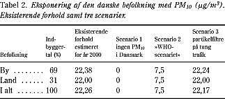Vi anvendte tre eksponeringsscenarier i beregningerne: 1) ingen PM10 -forurening i Danmark, 2) PM10 -forureningen er 7,5 μ g/m3 overalt i Danmark og 3) en estimeret PM10 -forurening i Danmark efter montering af partikelfiltre på al tung trafik i Danmark (Tabel 2 ). Det første scenario angiver den potentielle gevinst ved at eliminere luftforureningen, det andet scenario svarer til, hvad der blev regnet på i WHO-studiet, og med det tredje scenario vil vi demonstrere begrænsninger i forbindelse med at anvende beregninger som disse som beslutningsgrundlag i forbindelse med praktisk forebyggelse. Der er redegjort for beregningerne bag det tredje eksponeringsscenario andetsteds (13).