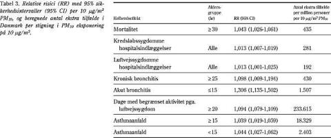 De relative risici i forbindelse med luftforurening er små (Tabel 3), hvilket indikerer en lille øget risiko for det enkelte individ. Den potentielle sundhedsmæssige gevinst ved at eliminere PM10 forurening i Danmark er stor, da hele befolkningen er eksponeret. De estimerede helbredseffekter, fx 435 dødsfald per million per år for en stigning i PM10 -koncentrationen på 10 μ g/m3 stemmer overens med en tidligere dansk beregning (8) og WHO-studiet (10). En række usikkerheder skal dog nævnes.