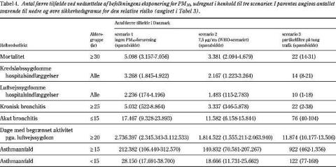 Materiale og metoder: Vi anvendte estimater for relativ risiko relateret til den udendørs partikelkoncentration, målt som PM 10 , baseret på den epidemiologiske litteratur. Befolkningens eksponering for partikelkoncentrationen blev beregnet. Antal årlige tilfælde, der kunne tilskrives partikelforurening blev estimeret for mortalitet, hospitalsindlæggelser for hjerte-kredsløbs- og luftvejssygdomme, kronisk bronchitis, akut bronchitis, sygedage og asthmaanfald. Vi søgte ligeledes at vurdere de mulige helbredsgevinster ved at montere partikelfiltre på alle tunge køretøjer i Danmark.