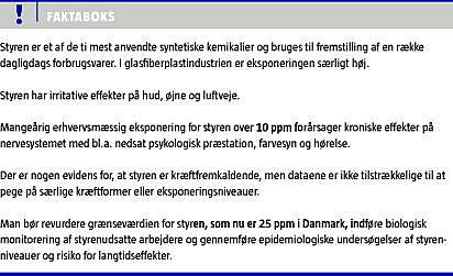 Summary Health effects following occupational styrene exposure in the reinforced plastics industry Ugeskr Læger 2012;174(5):267-270 This is a summary of the health risks of occupational styrene exposure based on recent reviews. We conclude about the exposure levels that there is strong evidence that styrene causes acute irritation of eyes and respiratory tract above 25 ppm, genotoxic effects above 10 ppm, and persistent nervous system effects with for instance reduced psychological performance, colour discrimination and hearing level following long-term styrene exposure above 10 ppm. There is moderate evidence of a causal association with cancer, but data are not sufficient to allow us to pinpoint specific cancers at risk or relevant exposure levels. We recommend reconsideration of the current Danish threshold limit value of 25 ppm, biological monitoring of styrene exposed workers, and epidemiological analyses of styrene exposure levels and long-term health effects among employees of the Danish reinforced plastics industry.