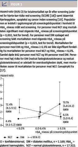 (rutinebehandling), eller til undervisning i intensiv behandling. Undersøgelsen er primært opgjort efter intention to treat-princippet med tæt på 100% opfølgning på primære endepunkter. Hvad betyder resultaterne for klinisk praksis? [17]: 1) at man ved én screeningsrunde uden rykkerskrivelse identificerer ca. 20% af de ikkeerkendte diabetikere, 2) at for hver person med diabetes, der blev fundet ved screening, identificeredes to med høj risiko for diabetes og seks uden diabetes, men med høj risiko for hjerte-kar-sygdom, 3) at kardiovaskulære risikofaktorer (vægt, rygestatus, blodtryk og kolesteroltal) var signifikant og markant forbedret fem år efter screeningstidspunktet i rutinebehandlingsgruppen og kun lidt bedre i den intensivt behandlede gruppe (Tabel 1). Intensiteten af farmakologisk behandling var høj i rutinebehandlingsgruppen og kun lidt højere i den intensivt behandlede gruppe (Tabel 1), 4) den beskedne forskel i behandlingskvaliteten mellem grupperne (Tabel 1) var associeret med 17% ikkesignifikant reduktion i første kardiovaskulære event i den intensivt behandlede gruppe sammenlignet med rutinegruppen (hazard ratio: 0,83, 95% konfidens-interval: 0,65-1,05), 5) en post hoc-analyse (Figur 1) viste, at de mest syge patienter med diabetes på screeningstidspunktet syv år senere havde en dødelighed, som ikke var forskellig fra dødeligheden i gruppen, som havde en normal glukosetolerans på screeningstidspunktet.
