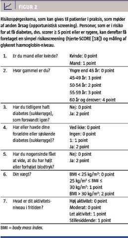 Den internationale ADDITION-koordinationsgruppe har i enighed konkluderet, at resultaterne indikerer, at tidlig opsporing af diabetes er associeret med en nettobehandlingsgevinst. Gruppen opfordrer derfor praktiserende læger til at iværksætte tidlig opsporing af diabetes og risiko for hjerte-kar-sygdom hos egne patienter, f.eks. via opportunistisk screening, som tager udgangspunkt i en højrisikostrategi [17]. Dette kan f.eks. gøres ved at give et spørgeskema med få spørgsmål om risikofaktorer for diabetes til den ønskede målgruppe (Figur 2). Personer, som er i risiko for at få diabetes eller er rygere, kan derefter få foretaget en simpel risikoscreening (hjerte-SCORE) [18] og måling af glykeret hæmoglobin-niveau). Personer med høj risiko for hjerte-kar-sygdom med eller uden diabetes bør tilbydes støtte til livsstilsændringer og forebyggende medicin. Disse anbefalinger er i overensstemmelse med Dansk Selskab for Almen Medicins diabetesvejledning.