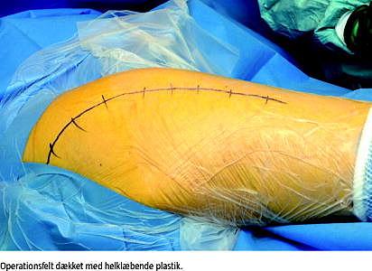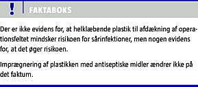 Fokus har primært været rettet mod de procedurerelaterede faktorer, som er lettere at håndtere end de patientrelaterede. Anvendelsen af profylaktisk antibiotisk behandling, antiseptisk præparation af huden, steril afdækning af operationsfeltet og overtryksventilation på operationsstuerne er velkendte eksempler. Anvendelsen af selvklæbende plast på opera-tionsfeltet, gennem hvilket incisionen foretages, er almindeligt ubredt ved mange forskellige operative procedurer. De bedst kendte produkter er OpSite (Smith & Nephew, England), Steridrape og Ioban (3M, USA). Nogle af produkterne er imprægneret med det antibakterielle middel iodid. Plasten klæbes på den antiseptisk præparerede hud, og teoretisk set virker produkterne som en barriere, der forhindrer spredning af bakterier fra hudens dybere lag og hårfolliklerne til incisionsstedet under operationen. På den anden side er der også en risiko for, at anvendelsen af det selvklæbende plast fremmer væksten af bakterier i de dybere hudlag og hårfolliklerne gennem en slags »drivhuseffekt« [3].