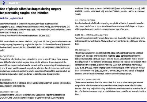<li>Webster J, Alghamdi A. Use of plastic adhesive drapes during surgery for preventing surgical site infection. Cochrane Database Syst Rev 2007;(4):CD006353.</li>