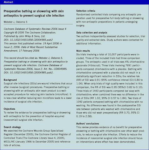 <li>Webster J, Osborne S. Preoperative bathing or showering with skin antiseptics to prevent surgical site infection. The Cochrane Database of Systematic Reviews 2006, issue 2. Art. No.: CD004985.pub2. DOI: 10.1002/14651858.CD004985.pub2.</li>
