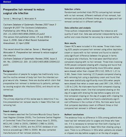 <li>Tanner J, Woodings D, Moncaster K. Preoperative hair removal to reduce surgical site infection. The Cochrane Database of Systematic Reviews 2006, issue 2. Art. No.: CD004122.pub2. DOI: 10.1002/14651858.CD004122.pub2.</li>
