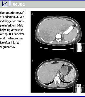 En 29-årig kvinde, der var i 21. gestationsuge, blev indlagt på en gynækologisk afdeling med abdominalia og febrilia. Fem dage forinden havde hun haft diarré, kvalme og opkastninger i to døgn. I forbindelse med en dyb venetrombose ni år tidligere havde hun fået diagnosticeret primær APS, hvorfor hun var i profylaktisk behandling med lavmolekylært heparin. Ved indlæggelsen påbegyndte man bredspektret antibiotikabehandling, og patientens heparindosis blev fordoblet. Der blev foretaget medicinsk abort med fødsel af et vækstretarderet foster, og efterfølgende blev der foretaget abrasio på grund af retineret væv. Klinisk og paraklinisk forværredes tilstanden, og patienten blev på tredje indlæggelsesdag overflyttet til en gastroenterologisk specialafdeling. Her blev der ved computertomografi påvist multiple leverinfarkter, vena portae-trombose samt bilaterale pleuraeksudater. Der var ikke tegn på Budd-Chiaris syndrom (Figur 1 ). Gennem de parakliniske fund bekræftede man HELLP-syndrom. Der sås hæmolyse med laktatdehydrogenase over 2.500 U/l, forhøjede levertal med alanintransaminase på over 5.000 U/l, samt trombocytopeni på 22 × 109 /l. Desuden sås der tegn på begyndende leversvigt i form af fald i koagulationsfaktoren (2, 7, 10) til 0,32 internationale enheder (IE) (Tabel 1 ). Der blev startet infusion med magnesiumsulfat. På fjerde indlæggelsesdag blev højdosissteroid initieret, og i det sjette døgn blev der substitueret med antitrombin. Herefter bedredes tilstanden, og patienten blev udskrevet en måned senere med normale levertal. Koagulationsfaktoren (2, 7, 10) forblev nedsat ved udskrivelsen på grund af behandling med vitamin K-antagonist. Ved kontrolskanning et år senere påvistes sequelae efter infarkt i segment syv (Figur 1).
