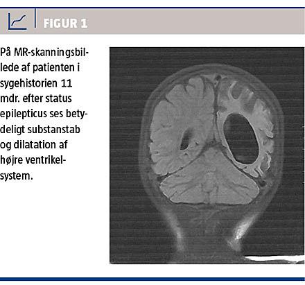 Ved opfølgning knap et år senere var hun ikke alderssvarende udviklet. Hun havde en højresidig parese med øget tonus, daglige epileptiske anfald og fremtrådte sprogligt og kognitivt som en toårig (biologisk alder knap fire år). En MR-skanning 11 måneder efter SE viste tilkommet betydeligt substanstab med let midtlinjeforskydning og dilatation af højre ventrikelsystem (Figur 1).