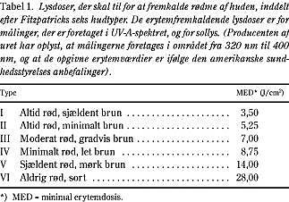 Lysdosis for optræden af hudrødme (solskoldning) benævnes minimal erytemdosis (MED). Fitzpatrick (2) har beskrevet seks hudtyper (Tabel 1 ). Disse værdier blev anvendt ved beregning af den tid, en person med en given hudtype kan opholde sig ubeskyttet i sollys, før der opstår solskoldning: varighed før erytem (timer) = 3,6 x lysintensitet (mW/cm2 ) x /MEDhudtype (J/cm2 ), hvor konstanten muliggør dimensionsndring fra mJ til J og fra sekunder til timer. Opholdsvarigheden i solen for de forskellige hudtyper er afbildet som funktion af s/o-ratio.