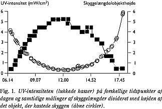 UV-lys-intensiteterne på forskellige tidspunkter af dagen er afbildet i Fig. 1 . I figuren er der korrigeret for sommertid, og det ses, at de højeste værdier ligger omkring kl. 12, hvor solhøjden når sit maksimum, hvilket illustreres ved kurven for forholdet mellem skyggelængde og objekthøjde (Fig. 1).