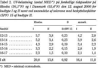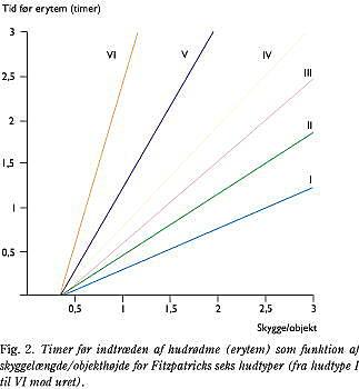 Resultater: Ved skygge/objekthøjde-ratio = 0,5 optræder der hos hudtyperne I og II, som er de hyppigst forekommende blandt danskere, rødme efter få minutter, ved skygge/objekthøjde-ratio = 1 efter 20-30 minutter og ved skygge/objekthøjde-ratio = 2 efter ca. en time. Ved Middelhavet vil den samlede UV-dosis fra solopgang til solnedgang på en skyfri dag i sensommeren være 30-50 gange den minimale erytemdosis, hvoraf over 60% falder i intervallet, hvor skygge/objekthøjde-ratio <1.