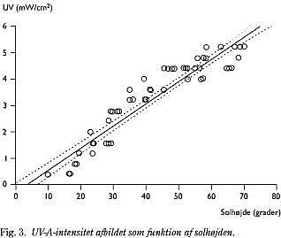 Forholdet mellem solhøjden og UV-intensiteten kunne beskrives ved den lineære relation, ligning 1: UV (mW/cm2 ) = -0,2539 + 0,08345 x SOLHØJDE (grader) (R = 0,95) (Fig. 3 ).