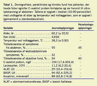 Af oplysninger fra journalerne fremgik det, at den mediane varighed af temperaturforhøjelse var to (spændvidde: 0-14) dage, og at den gennemsnitlige temperatur var 38,3 °C (sd: 0,93 °C). Tres (55%) patienter angav oplysninger, der tydede på en gastrointestinal/urogenital lidelse, mens 35 (32%) af patienterne havde symptomer fra andre væv eller organer. Hos de resterende 14 (13%) patienter var der ikke beskrevet symptomer. I alt 11 (10%) af patienterne fik foretaget ultralydskanning af abdomen på indikationerne monosymptomatisk feber og/eller CRP-forhøjelse.