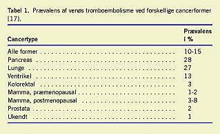 Den samlede forekomst af VTE hos cancerpatienter er opgjort til at være 10-15% med en variation på op imod 30% ved lunge- og pancreascancer til et par procent ved mamma- og prostatacancer samt kolorektal cancer [17] (Tabel 1). VTE, hyppigst i form af PE, regnes for at være den næsthyppigste dødsårsag efter primær sygdom [4]. Det er vist, at hver syvende cancerpatient, der dør under hospitalisering, dør af PE, og af dem, der dør som følge af PE, har 60% lokaliseret eller begrænset spredning af deres cancer, hvorfor PE hos disse patienter kan anses for at være den direkte dødsårsag [18].