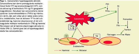 Fra flere studier ved man, at der ved cancer sker en aktivering af prokoagulante molekyler og en hæmning af fibrinolysen, hvilket samlet giver en hyperkoagulabel tilstand og derved øget risiko for at der udvikles VTE [2, 21]. Det er en kompliceret proces, der involverer flere forskellige mekanismer [21]: Cancercellerne selv kan foretage ekspression af prokoagulante molekyler herunder cancerprokoagulant (CP) og tissue factor (TF) [16], som kan aktivere koagulationen. Derudover danner cancercellerne en række cytokiner, der aktiverer koagulationen. Det foregår ved at aktivere TF og hæmme antikoagulante molekyler og fibrinolysehæmmere på bl.a. endotelceller og trombocytter (Figur 1).