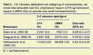 Inden for de seneste 10-15 år er der blevet publiceret flere studier, hvori man har sammenlignet LMWH og UFH til behandling af DVT. Efterfølgende metaanalyser af disse studier [8-10], hvor der er set på subgrupper af cancerpatienter, tyder på, at patienter behandlet med LMWH har en øget 3-6-måneders-overlevelse sammenlignet med gruppen af patienter, der blev behandlet med UFH (Tabel 2). Resultaterne bør dog betragtes kritisk, da studierne ikke var designet til vurdering af sådanne forskelle. Studierne har dog betydet en øget interesse for LMWH's mulige virkninger på canceroverlevelse. Der er derfor efterfølgende iværksat flere kliniske randomiserede studier til afprøvelse af LMWH's virkning på overlevelsen hos cancerpatienter, og foreløbig er tre sådanne studier publiceret.