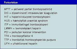 Herudover ses HIT-relateret trombocytopeni relativt sjæl-dent efter perkutan koronar intervention (PCI). På trods heraf kan der ses svær trombocytopeni få timer efter PCI, hvor der er anvendt UFH samtidig med en trombocyt glykoprotein GP IIb/IIIa (fibrinogenreceptor)-antagonist. Der er naturligt forekommende antistoffer, som reagerer mod GP IIb/IIIa-antagonisten, og det vil ofte være den udløsende årsag til faldet i trombocytantallet. Hvis HIT fejlagtigt diagnosticeres i denne gruppe, og patienten sættes i anden antikoagulant behandling, kan det medføre alvorlige blødninger. Når heparinbe-handlingen afsluttes, kan trombocytantallet falde som tegn på begyndende HIT. Delayed-onse t -HIT kan ses hos indlagte patienter, og patienter der henvender sig hos deres praktiserende læge. De vil typisk have en stærkt positiv HIT-antistoftest [4]. Lungeemboli kan være fulgt af moderat trombocytopeni. Opstår dette i et postoperativt forløb, hvor der profylaktisk er givet heparin, kan det være svært at skelne mellem lungeemboli og HIT uden foreliggende HIT-antistofanalyse. Dissemineret intravaskulær koagulation (DIC), trombotisk trombocytopenisk purpura (TTP), hæmolytisk-uræmisk syndrom (HUS) og immunbetinget trombocytopeni (ITP) er også karakteriseret ved udvikling af trombose. I tvivlstilfælde må der undersøges for HIT-antistoffer samt for de øvrige tilstande. Patienter med antifosfolipid syndrom vil klinisk kunne ligne HIT, i det patienterne kan have trombocytopeni og trombose. Antifosfolipidsyndromet og HIT kan differentieres på tilstedeværelsen af de forskellige antistoffer (henholdsvis lupusantikoagulans og HIT-antistoffer).