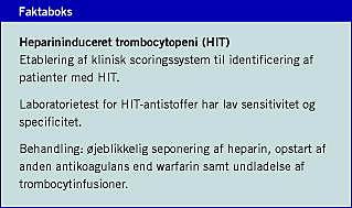 Heparinbehandling kan forårsage immunmedieret trombocytopeni (HIT). HIT-antistoffer kan detekteres ved hjælp af en række meto-der, men laboratorieanalyser er hverken tilstrækkeligt specifikke eller tilstrækkeligt sensitive, og deres anvendelse kan forsinke det diagnostiske forløb. Det er derfor vigtigt, at anden behandling påbegyndes på baggrund af de kliniske fund, og der foreslås et system til klinisk scoring af HIT-risiko. Når det er sandsynligt, at der opstår HIT, bør behandling bestå i øjeblikkelig heparinsubstitue-ring med antikoagulantika og seponering af behandling med warfarin og trombocytter.