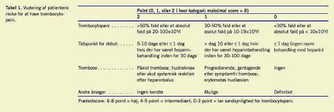 Trombocytopeni ses hyppigt hos indlagte patienter, som be-handles med UFH. Kun få vil dog have HIT. Et klinisk scoringssystem er derfor egnet til identifikation af patienter med mulig HIT. For at undgå komplikationer, er det afgørende, at heparinbehandlingen standses og erstattes af anden antikoagulant behandling umiddelbart efter, at mistanken om HIT er etableret. Tabel 1 viser et klinisk scoringssystem som foreslået af Theodore Warkentin til at identificere patienter med stor klinisk sandsynlighed for HIT [5]. I algoritmen indgår de karakteristiske observationer trombocytopeni, tidspunkt, trombose og fraværet af andre (oTher ) forklaringer - også benævnt de fire T'er. HIT er usandsynlig (< 5%), når scoren er lav (≤3) men sandsynlig (> 80%) ved en høj score (≥6). En intermediær score (4 eller 5) indikerer en klinisk profil, der er forenelig med HIT, men med tilstedeværelse af andre mulige årsager. Laboratorieundersøgelse for HIT-antistoffer er specielt indiceret hos den sidste gruppe af patienter.