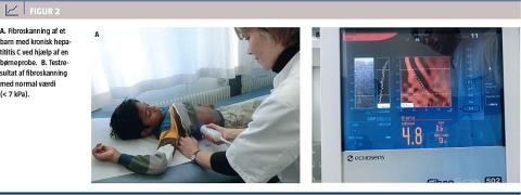 Der tages blodprøver til bestemmelse af HCV-genotype, kvantificering af HCV-RNA, HBV og hiv-test, lever- og koagulationsfunktion, D-vitaminniveau samt stofskifte. Vaccination for hepatitis A og B gennemføres for at undgå alvorlig sygdom ved koinfektion. Ved påvist levercirrose screenes barnet for øsofagusvaricer ved gastroskopi. Der tages evt. leverbiopsi. Dette kan udelades ved behandling af HCV-inficerede børn med genotype 2 eller 3 på grund af godt respons på medicinsk behandling og den kortere behandlingstid. Der foretages en fibroskanning af leveren, dvs. en ultalydundersøgelse, hvor leverens stivhed måles med ultralydbølge, hvilket anvendes som mål for leverfibrose [27]. Hos voksne med kronisk HCV er der fin overensstemmelse imellem fibroskanning og fibroseindhold i leveren. Metoden er under udvikling til anvendelse hos børn. Kun på få centre har man børneprober til fibroskanningsudstyret (Figur 2).