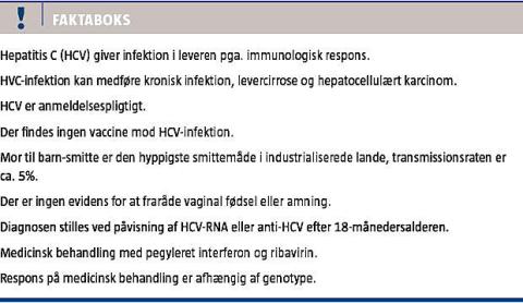Hepatitis C (HCV) er et verdensomspændende sundhedsproblem forårsaget af en flavivirus, der kan give leversygdom, herunder akut og kronisk hepatitis, levercirrose og hepatocellulært karcinom (HCC). HCV har en global prævalens på 2-3%, hvilket svarer til ca. 180 mio. inficerede ifølge World Health Organisationen (WHO) [1]. I Danmark anslås det, at ca. 16.000 personer har kronisk HCV, og skønsmæssigt er 30-60 under 18 år [2]. Kronisk HCV har været anmeldelsespligtig i Danmark siden 2000. Mennesket er eneste kilde til HCV-infektion, der overføres fra mor til barn (vertikalt) eller parenteralt igennem kontaminerede nåle og blodprodukter. Screening for HCV i blodprodukter blev indført i begyndelsen af 1990 i Europa og i Danmark fra 1991, hvilket har medført reduktion i smitte ved transfusion. WHO estimerer dog, at op til 43% af donorblod i udviklingslandene ikke screenes adækvat for HCV [1]. I lande med effektiv screening af donorblod er vertikal transmission således blevet den hyppigste transmissionsmåde af HCV til børn. Risikoen for vertikal transmission er 2-5%, og den er afhængig af mængden af virus (viral load) hos moderen [3]. Risikoen er højere, op til 15%, hvis mødrene også er hiv-positive og ikke er velbehandlede med fuldt supprimeret hiv-virus – formentlig pga. høj viral load og kompromitteret immunrespons [4]. Det er ikke kendt, hvornår mor til barn-HCV-transmission finder sted. Elektivt kejsersnit nedsætter ikke risikoen for vertikal transmission. Endvidere øger amning ikke smitterisikoen trods påvisning af HCV-RNA i kolostrum [5]. HCV-antistoffer transmitteres passivt, så børn, der er født af HCV-positive mødre, kan være positive op til 15-månedersalderen pga. maternelle antistoffer. Hos nyfødte, der kan være smittet med HCV, stilles diagnosen ved påvisning af HCV-RNA tidligt i forløbet eller anti-HCV og HCV-RNA fra 18-månedersalderen [6]. Sundhedsstyrelsen anbefaler at screene internationalt adopterede børn og børn af HCV-positive mødre. Interfamiliær smitte estimeres til at være meget lille (< 2%). Der findes ingen vaccine mod HVC-infektion.