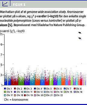 I fem såkaldte genome-wide association studies har man påvist, at genetisk variation ved interleukin (IL ) 28B-genet er forbundet med både spontan viruskontrol og behandlingsrespons (Figur 1 ). I det forløbne år er sammenhængen blevet bekræftet i flere end 15 uafhængige studier, herunder også i Danmark [2]. IL28B koder for interferon-λ, der har vist sig at have antiviral aktivitet over for HCV og at have en betydeligt lavere bivirkningsprofil end pegIFN-α. Bærere af én og særligt to risikoalleler havde nedsat sandsynlighed for at opnå spontan kontrol eller at respondere på behandling. Behandlingsresponset over for pegIFN/RBV ved HCV-genotype 1-infektion hos hvide, der ikke havde risikoallelen, var 80%, mens den var knap 40% hos bærere af én risikoallel og omkring 30% hos bærere af to risikoalleler [3]. Mønsteret var tilsvarende, men behandlingsresponset var mindre blandt sorte amerikanere. Det kaster et vist lys over den grundliggende årsag til den kendte forskel i behandlingsrespons, der er betinget af etnisk gruppe, da risikoallelen er sjælden i en asiatisk befolkning (5-30%) og hyppigere blandt afrikanere (45-75%) [4]. I Danmark er allelfrekvensen ca. 25%. Spontan viruskontrol varierer også mellem etniske grupper, således at asiatere har den højeste frekvens af kontrol, mens afrikanere har den mindste. Hvide følger et intermediært mønster. Hvilken betydning har IL28B i en klinisk hverdag? Foreløbig ingen, men potentialet er stort. Effekten af pegIFN/RBV afhænger i høj grad af HCV-genotypen. Individer, der er smittet med genotype 1 eller 4 og er bærere af risikoallelen, vil have en meget lav sandsynlighed for at have effekt af behandling med pegIFN/RBV. De vil være kandidater til behandling med nye lægemidler, de såkaldte direct acting antivirals, som er under udvikling. På den anden side vil individer, der er smittet med genotype 2 eller 3 og ikke er bærere af risikoallelen, muligvis kunne nøjes med en kortere behandling med pegIFN/RBV og dermed undgå alvorlige bivirkninger. Prospektive studier må afgøre, om der er grundlag for sådanne farmakogenetiske strategier.