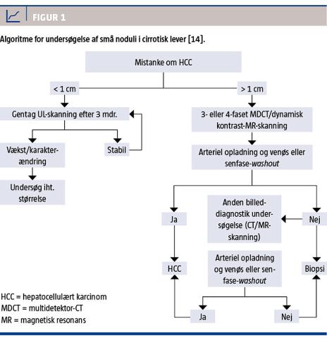 Hvis der ved UL-screening og/eller pga. forhøjet AFP er mistanke om HCC, følger den videre opfølgning og behandling algoritmerne i Figur 1 og Figur 2 [14]. Hvis tumoren er > 1-2 cm i diameter ved UL-skanning, udføres der normalt trefaset CT med kontrast eller dynamisk kontrast-MR-skanning. Ved disse billeddiagnostiske undersøgelser kan en karakteristisk arteriel opladning og venøs eller senfase-washout ses, hvilket er diagnostisk for HCC i en cirrotisk lever [4]. Kun i tvivlstilfælde ved billeddiagnostik eller ved mistanke om HCC i normalt levervæv er en biopsi nødvendig. Biopsi i en cirrotisk lever er forbundet med risiko for blødning og needle track seeding (spredning af cancer til biopsinålens indstikskanal) [21].