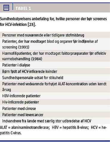 I 2012 kom der nye anbefalinger fra det amerikanske Centers for Disease Control and Prevention (CDC) om at screene alle amerikanere, som var født i »babyboomperioden« 1945-1965, for HCV-infektion [9], modsat tidligere, hvor CDC, som Sundhedsstyrelsen i Danmark, kun anbefalede screening af personer med øget risiko for HCV-infektion. Ændringerne i anbefalingerne skyldes bl.a., at mange inficerede ikke er klar over deres HCV-status, og at der nu findes gode behandlingsmuligheder for KHC [9]. I Danmark er sådanne screeningstiltag ikke indført; Sundhedsstyrelsen anbefaler fortsat udelukkende screening af risikopatienter [23] (Tabel 1).