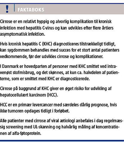 Infektion med hepatitis C-virus (HCV) er et globalt problem med ca. 150 mio. kronisk inficerede personer [1], hvoraf 10-40% får levercirrose i løbet af årtier med en øget risiko, som internationalt er opgjort til 1-8% årligt for udvikling af kræft, hepatocellulært karcinom (HCC), i leveren [2-4]. HCC, som kan opstå i en cirrotisk lever uanset cirrosens ætiologi, er en alvorlig kræftsygdom og den tredjehyppigste cancerdødsårsag på verdensplan [3, 5]. Patienter med kronisk hepatitis C (KHC) og cirrose tilbydes pga. den høje risiko screening for HCC med regelmæssige UL-undersøgelser og målinger af koncentrationen af alfa-føtoprotein (AFP) [6]. Risikoen for, at en patient med KHC får cirrose, øges ved tilstedeværelse af risikofaktorer som mandligt køn, koinfektion med hepatitis B-virus (HBV) – og/eller humant immundefektvirus (hiv), høj alder på smittetidspunktet og et stort dagligt alkoholforbrug [7].
