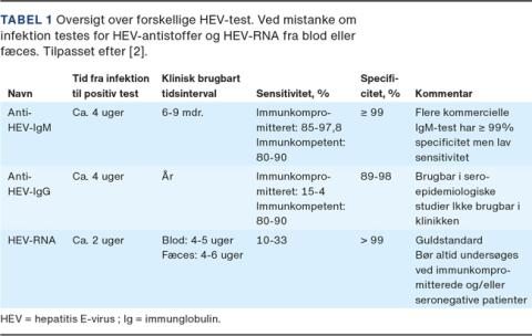 HEV-prøver to gange undersøgt med 15 dages mellemrum otte uger efter debut var positive for HEV-IgG og -IgM i blodet. PCR for HEV-RNA i blod og fæces var negative. Klinisk var der fuld remission efter et år.