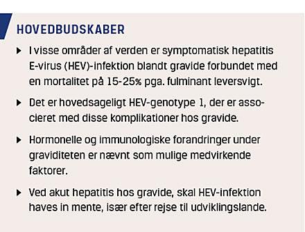 Inden for de seneste år er vores opfattelse af HEV ændret på væsentlige punkter. Med hensyn til HEV-infektion blandt gravide er der fundet store regionale forskelle på morbiditet og mortalitet. Om end den kraftigt forhøjede dødelighed blandt gravide helt overvejende ses i udviklingslande, hvor HEV1 er endemisk, er der også inden for disse endemiske områder stor forskel i mortalitet. Baggrunden herfor er i vid udstrækning uafklaret.