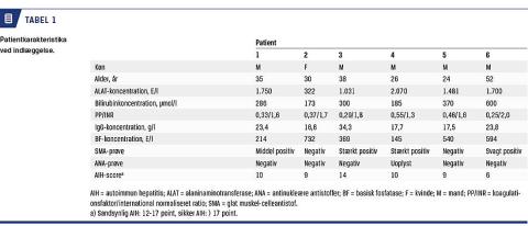 Vurderet ud fra de internationale diagnostiske AIH-kriterier, der omfatter såvel køn som biokemiske, histologiske og potentielt hepatotoksiske parametre, var diagnosen AIH ikke sikker hos nogen af patienterne, men »sandsynlig« hos tre patienter og »ikke sandsynlig« hos tre, jf. Tabel 1.