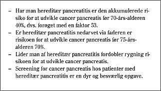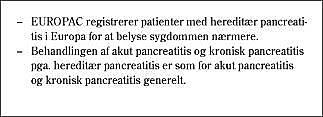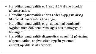 Hereditær pancreatitis (HP) er en relativt nyopdaget, autosomalt dominant arvelig sygdom med 80 % penetrans. Hos 60 % af patienterne kan der påvises en mutation i genet, som koder for trypsinogen. De resterende 40 % af HP- patienterne får stillet diagnosen på basis af kliniske kriterier. HP giver symptomer i form af akut pancreatitis i barneårene og fører senere til kronisk pancreatitis. Den akutte og den kroniske pancreatitis behandles som vanligt. Det er vigtigt at erkende sygdommen, da patienter med HP har en 50 gange forøget risiko for udvikling af cancer pancreatis. Ved 70 - års-alderen har 40 % udviklet cancer pancreatis. Risikoen fordobles ved cigaretrygning. Screening af HP patienter mhp. cancer pancreatis er imidlertid en besværlig og bekostelig affære.