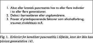 I langt de fleste tilfælde af kronisk pancreatitis påvises langvarigt alkoholmisbrug. I Skandinavien antages alkohol at være årsag til 60 -70 % tilfælde af kronisk pancreatitis. Andre årsager til akut og kronisk pancreatitis er galdestenssygdom, hyperlipoproteinæmi og hyperparatyroidisme, men hos 25 -30 % findes der ingen årsag (1). En del af disse patienter har arvelige defekter i genet, som koder for trypsinogen. Sygdommen kaldes hereditær pancreatitis (HP) eller arvelig bugspytkirtelbetændelse. HP er årsag til 1 % af alle tilfælde med pancreatitis (2). HP debuterer allerede i teenageårene med tilbagevendende tilfælde af akut pancreatitis og er den 2. hyppigste årsag til kronisk pancreatitis hos unge (3). Sygdommen diagnosticeres ved påvisning af genmutationer eller ved opfyldelse af et kriteriekompleks (Fig. 1 ).