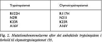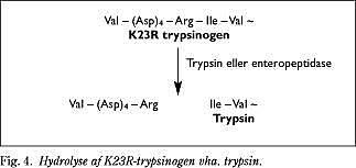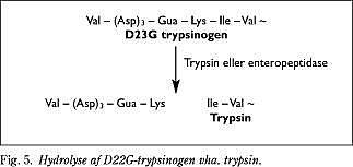 Ved K23R- mutationen er lysin (K) substitueret med arginin (R). Mutationen sker netop ved kløvningsstedet for aktiveringspeptidet TAP. Selv om arg-ile-bindingen er et dårligt substrat for trypsin (19), giver substitution af lysin med arginin en ti gange hurtigere hydrolyse af trypsinogen (9) (Fig. 4 ).